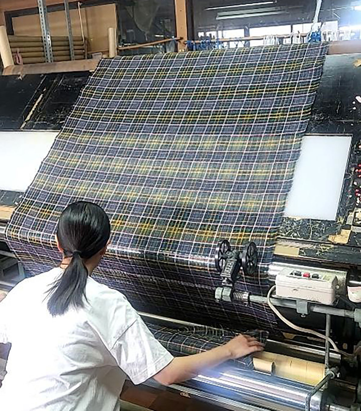 出来上がった生地のキズや汚れを目視で確認
