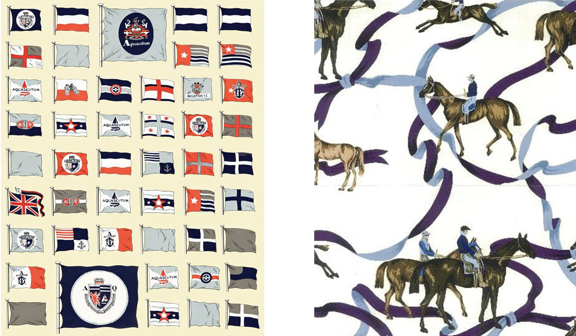 旗モチーフは、当時のテーマであろうマリンのポップな軽やかさを、馬とリボンはクラシックな気品を漂わせます。