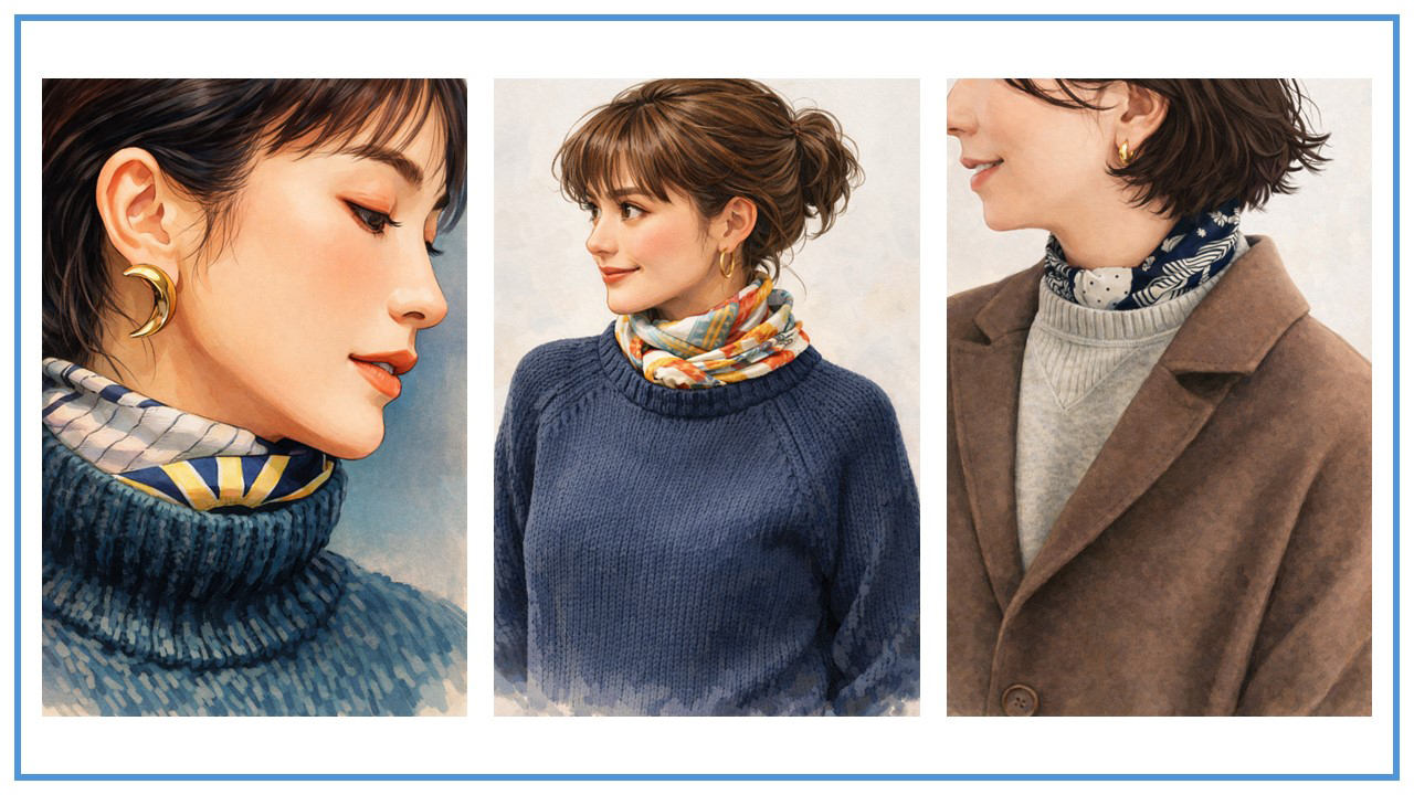 冬の装いに少し変化を加えたい時、大判マフラーでは重たく感じ始める春先に、アクセントになる着こなしの1つとして活躍するスカーフアレンジです。