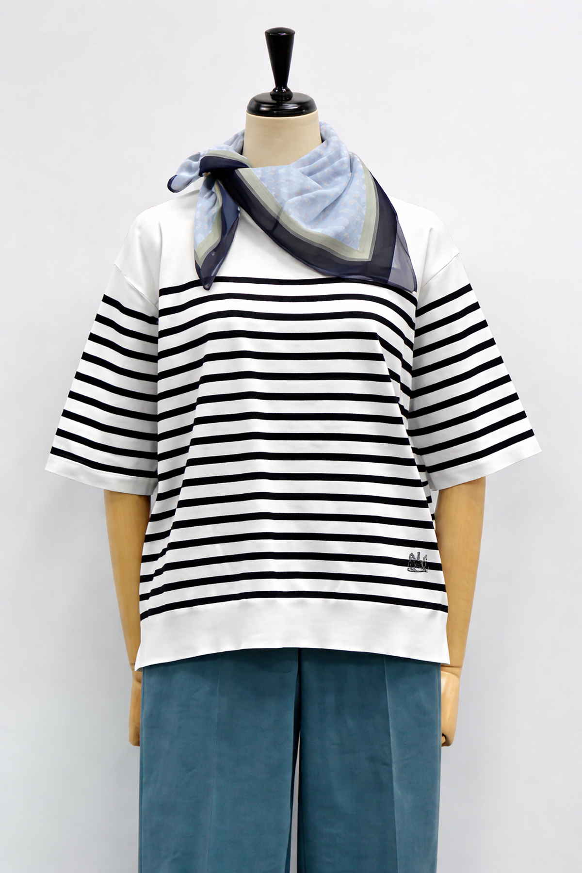 誰もが一枚は持っているボーダーのニットやカットソー。アクアスキュータムでも長く支持されてきた日常に寄り添う定番アイテムです。そんなボーダーに柄スカーフを重ねることで、肩の力を抜きながらも、どこか洗練されたムードに。